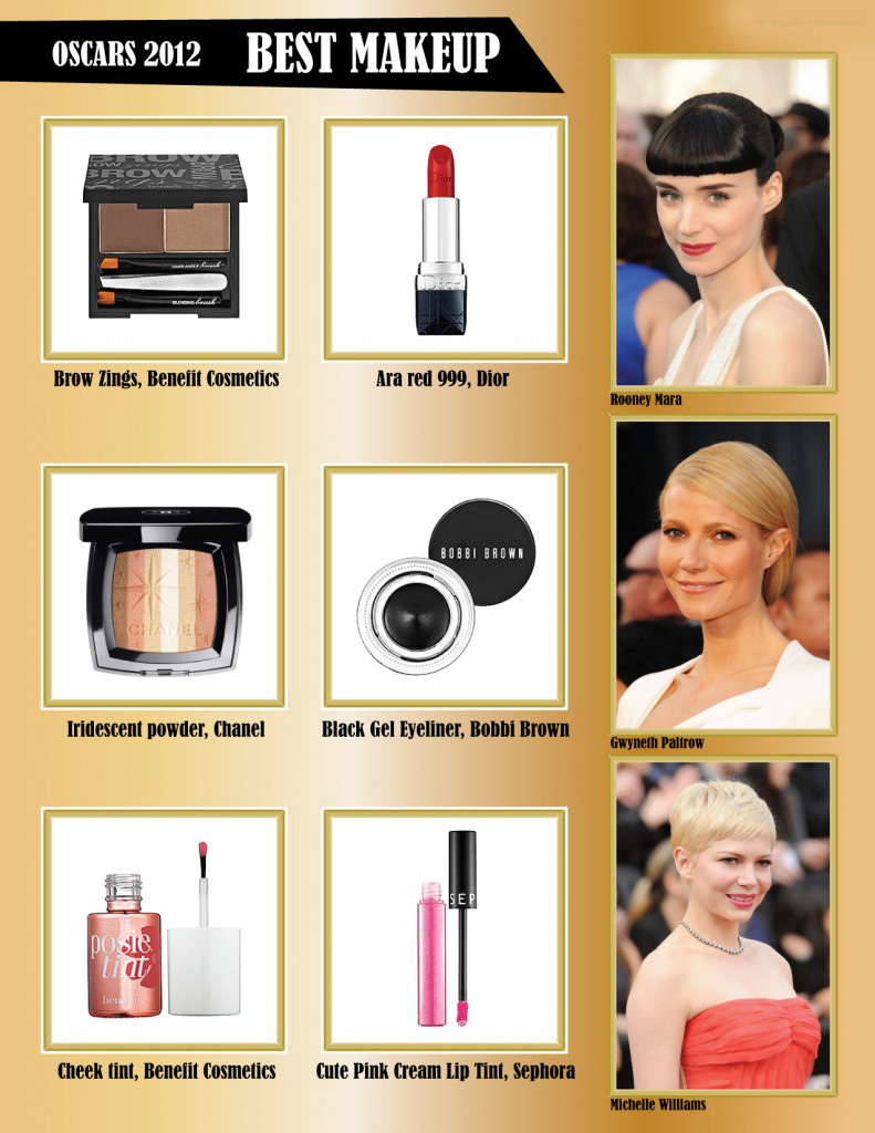 2012 Oscar makyajlarından ilham almak isteyenlere önerim; sade ama şık bir görünüm yaratmak istiyorsanız gözlerinize pastel tonlarda ışıltılı bir göz farı, yanaklarınıza ten renginizle uyumlu açık pembe veya şeftali tonlarında hafif simli bir allık ve dudaklarınıza ise nude renkte ya da yumuşak doğal tonlarda bir ruj veya parlatıcı sürmeniz.