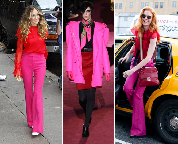 Pembe ve kırmızı birlikteliği: Bu iki renk hayatta olmaz! Bu evlilik yü-rü-mez. Öyle bir oluyormuş ki… Bakalım daha neler öğreneceğiz. Ben bu trendi sevdim kızlar. Tarzını uydurun; düz kırmızı düz pembe, biri alt biri üst. Bu kadar basit!