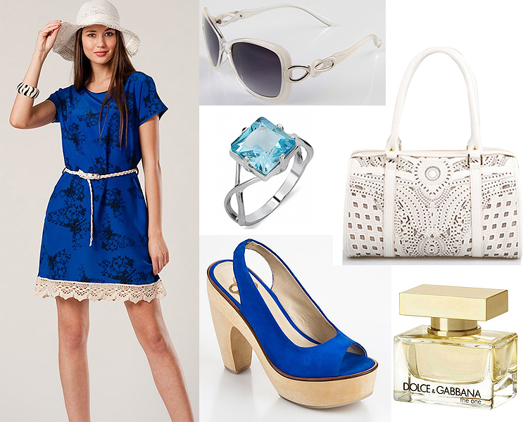 Etek ucu nostaljik dantel kupürleri ile süslü, üzerinde kelebek baskıları bulunan saks mavisi mini bir elbiseyi; yine aynı ton süetten oluşan tabanı açık renk tahtadan çok tarz bir sandalet ve etek ucundaki dantel motifleri ile birebir uyacak dantel şeklinde işlenmiş bej – beyaz renkli deri bir çanta ile kombinledim.