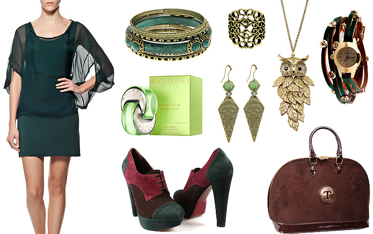 Üzerinde buruşuk şifondan bir tunik bulunan yeşil mini bir elbiseyi; yeşil, bordo ve kahve tonlarından oluşan bir çift süet topuklu ayakkabı ve yine süetten kahverengi bir çanta ile kombinliyorum.
