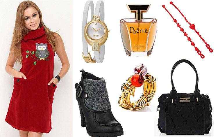 Bu hafta sizler için hazırladığım tasarımda baykuşlu kırmızı mini bir elbiseyi, bilekten yarım kesik üstü yün detaylı kalın topuklu bir bot ve siyah şık bir el çantası ile kombinliyorum.