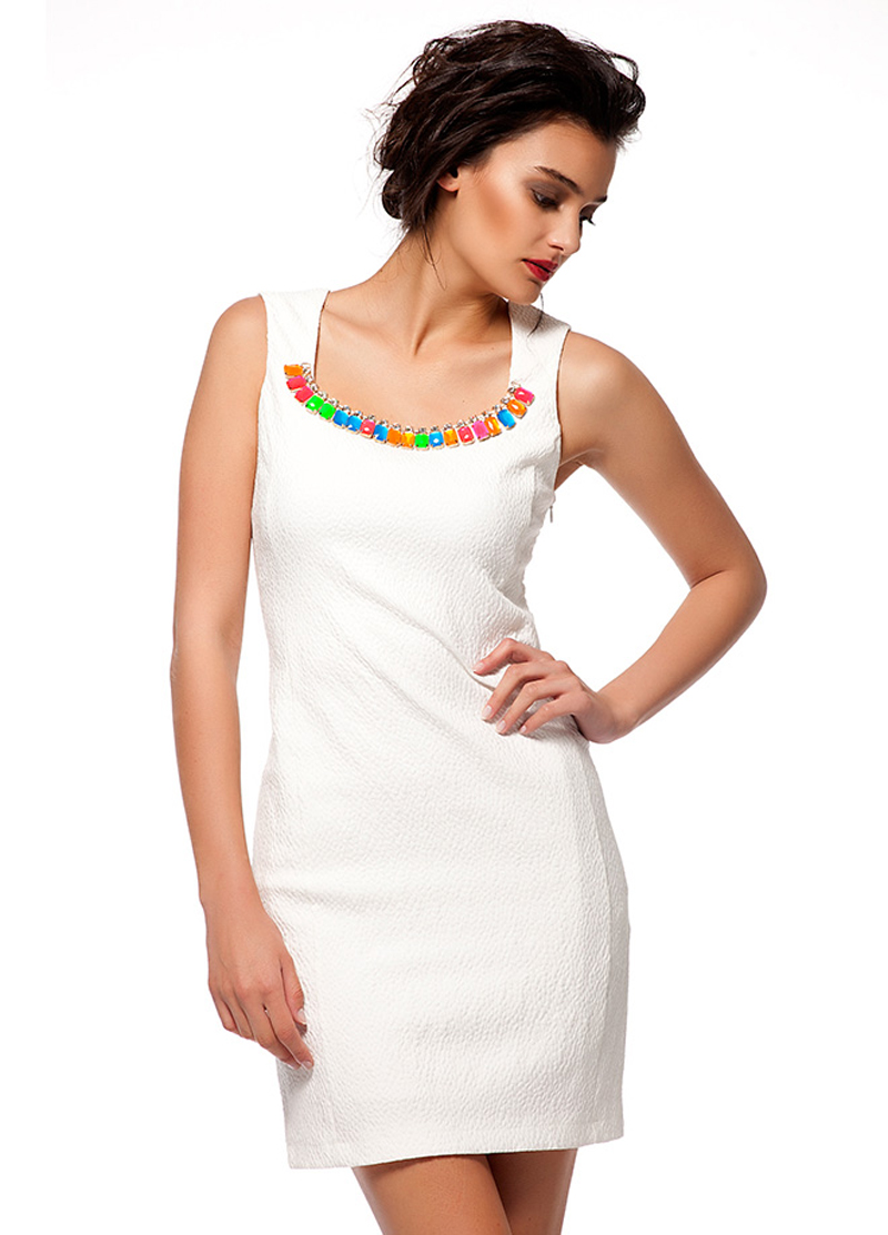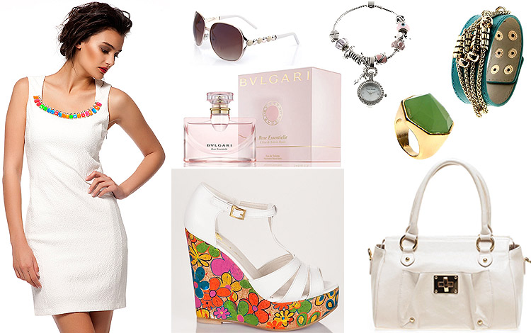 Bu hafta, yaka bölümü rengârenk taş aksesuarlarla bezeli beyaz mini bir yazlık elbiseyi; renkli çiçek desenleriyle süs mantar platform tabanı ile göz alan beyaz bir çift sandalet ve yine beyaz şık bir el çantası ile kombinledim.