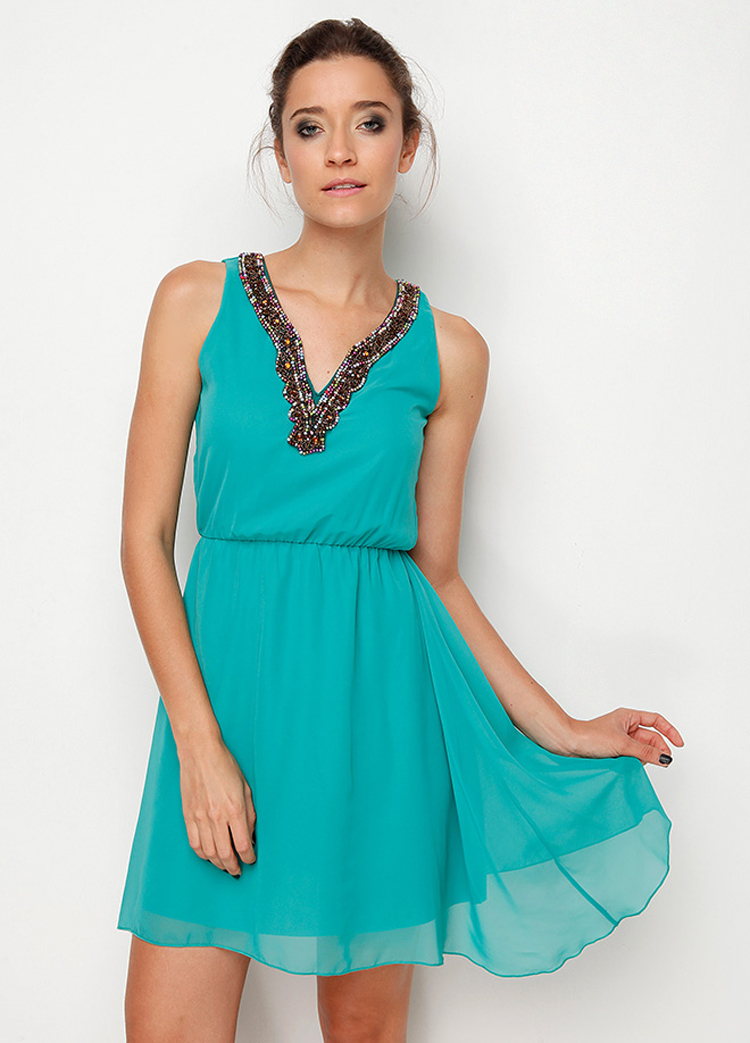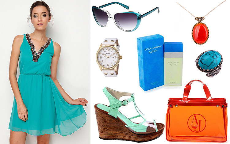 Tatilde, akşam gezmelerinde hatta biraz şık şıkıdım olunması gereken bir günde kullanılabilecek bu haftaki kombinimde; turkuaz renkli mini yazlık bir elbiseyi; su yeşili ve kahverengi tonlarında platform topuklu bir sandalet ve sezonun favori aksesuar trendlerinden turuncu bir şeffaf el çantası ile kombinliyorum.