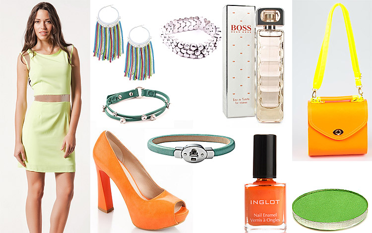 Bu haftaki kombinimde su yeşili tonlu transparan detaylarıyla göz alan bir dekolteye sahip yazlık bir mini elbiseyi; turuncu renk topuklu ayakkabılar ve neon turuncu ve sarı renklerine sahip sevimli bir kutu çanta ile kombinliyorum.