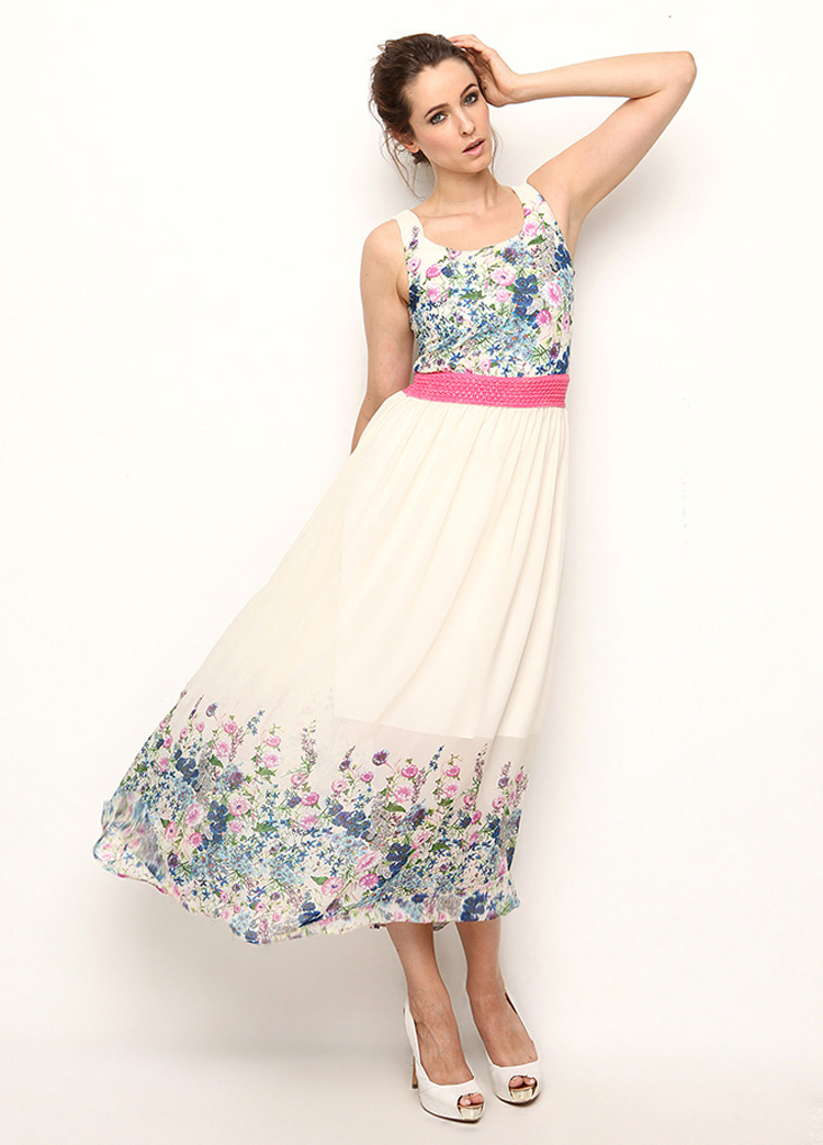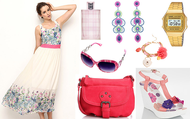 Bu hafta sizler için pembe, mavi ve beyaz tonlarından oluşan çiçek desenli askılı uzun bir yazlık elbiseyi; üzeri sevimli çiçeklerle süslü pembe dolgu topuk bir çift sandalet ve şeker pembesi spor bir askılı çanta ile kombinliyorum.