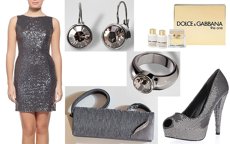 Üzeri simli koyu gri payetlerle kaplı mini bir abiye elbiseyi; yine koyulu ve açıklı gri tonlardaki payetlerden oluşan prestijli bir çift topuklu ayakkabı ve gri tonunda yalın tasarımlı bir portföy çanta ile kombinliyorum.