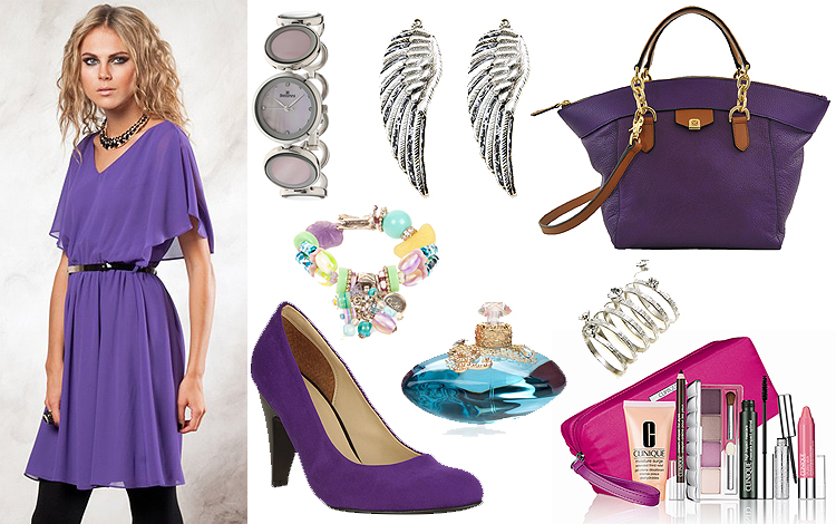 Lila rengi şifon mini elbisemizi, koyu mor tonunda 2012 kış modasına uygun büyük bir el çantası ve yine aynı tonda bir çift topuklu ayakkabı ile kombinliyorum.