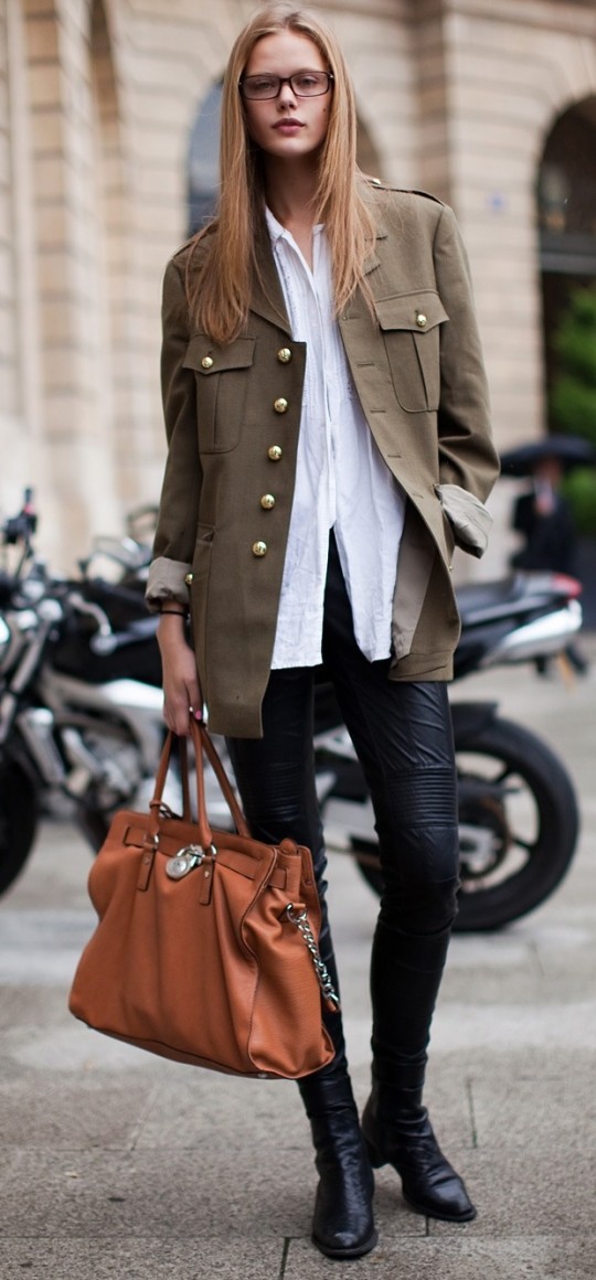 Altta gördüğünüz fotoğrafta ise açık uçuk yeşil renkli military ceket, taba rengi çantayla son derece uyumlu kullanılmış.
