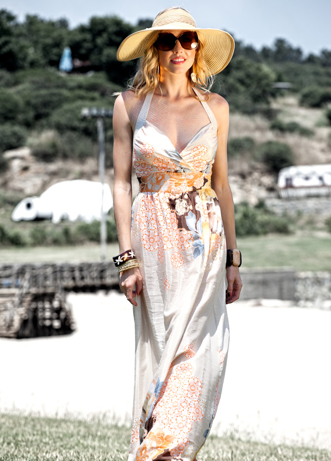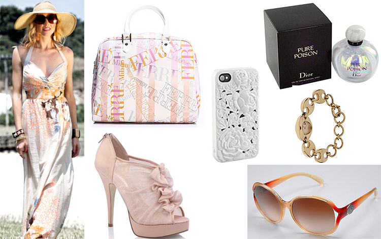Boyundan bağlamalı dekolteli göğsü ile seksi bir hava yaratan açık pastel tonlardan oluşan uzun yazlık bir elbiseyi; pudra renkli üzeri fiyonklarla zenginleştirilmiş burnu açık bir çift topuklu ayakkabı ve elbisenin ve ayakkabının tonlarını destekleyen Ferre Milano markasına ait çok prestijli ve şık bir el çantası ile kombinliyorum.