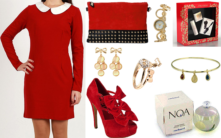Bu haftaki kombinimde beyaz bebe yakalı kırmızı mini bir elbiseyi; fiyonk detaylarıyla göz alan sevimli bir çift kırmızı süet topuklu ayakkabı ve yine kırmızı süetten oluşan altında siyah deri ve zımba bir bölüm de barındıran portföy bir çanta ile kombinliyorum.